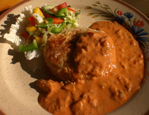 Zuerst Soße kalt anrühren: Tomatenmark, gewürfelte Zwiebel, Saft der ½ Zitrone, Rosenpaprika (nicht sparen), gehackte Kräuter und Sahne verrühren, mit Salz, Pfeffer und 1 Prise Zucker abschmecken. Fischfilet in eine gebutterte Auflaufform geben, mit der Soße übergießen, geriebenen Käse darüber verteilen und ca. 40 Minuten bei 180° überbacken. Dazu schmecken Salzkartoffel, Reis, grüner Salat