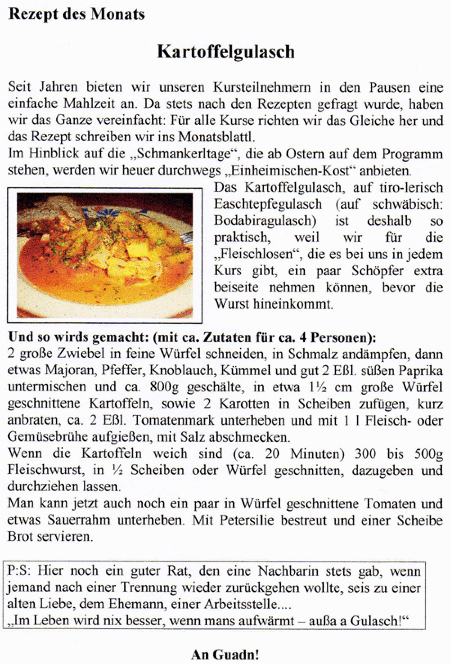 Kaspreßknödel: Nachdem wir beim Themenabend „Für Leib und Seel“ im Februar als traditionellen Fastenspeise Kaspreßknödel angeboten haben, baten einige Teilnehmer aus anderen Kursen: „Macht doch für uns auch welche!“ Sehr gerne kommen wir diesem Wunsch nach, denn sie gehören zu unseren persönlichen Leibspeisen.